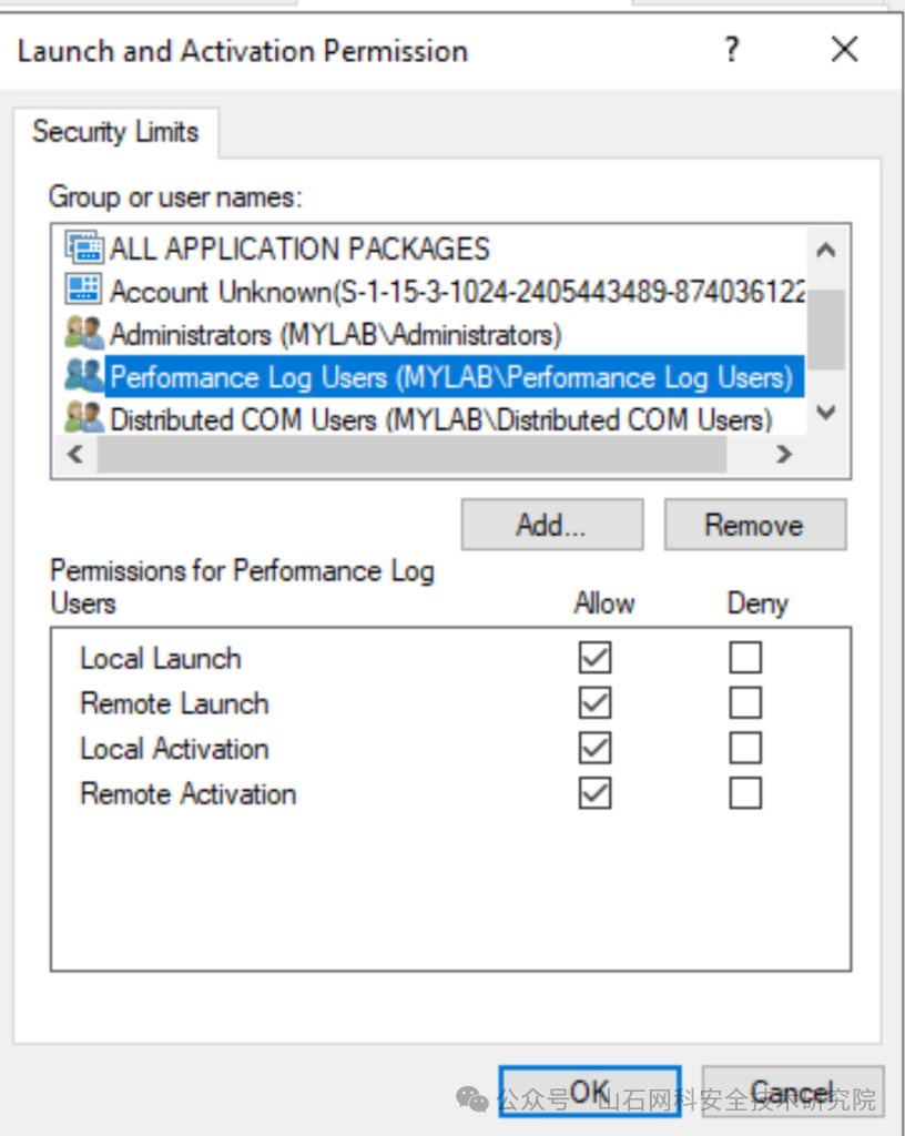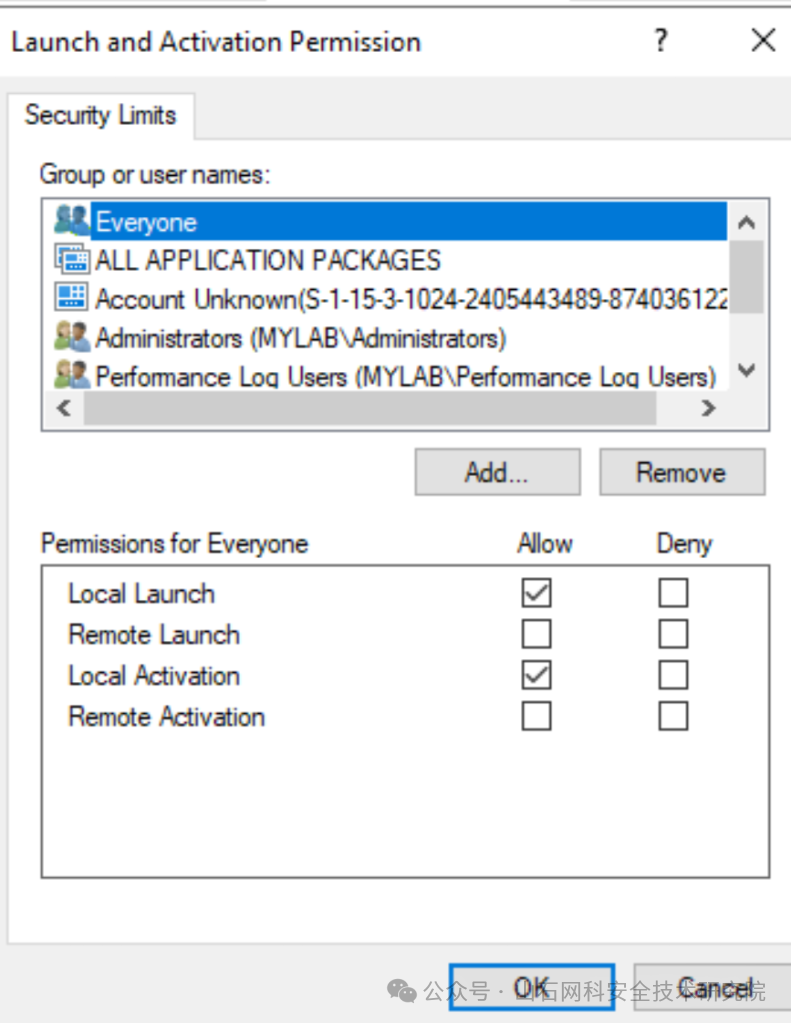 Everyone只能在本地激活和启动应用程序,但是,这里有两个特别的组,Distributed COM Users 和 Performance Log Users,他们可以远程激活和启动应用程序: