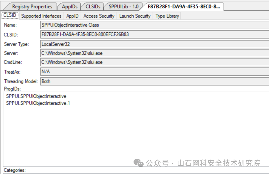 这个应用程序的 CLSID 是 F87B28F1-DA9A-4F35-8EC0-800EFCF26B83 - SPPUIObjectInteractive Class,它作为一个本地服务器运行:
