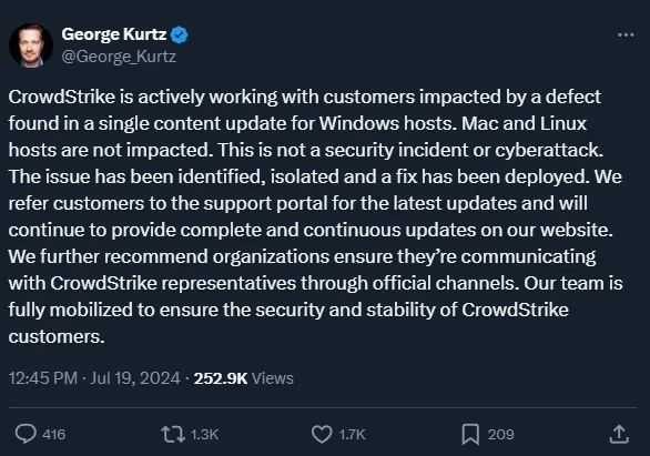 CrowdStrike 首席执行官就故障更新导致 Windows 主机崩溃一事发表评论