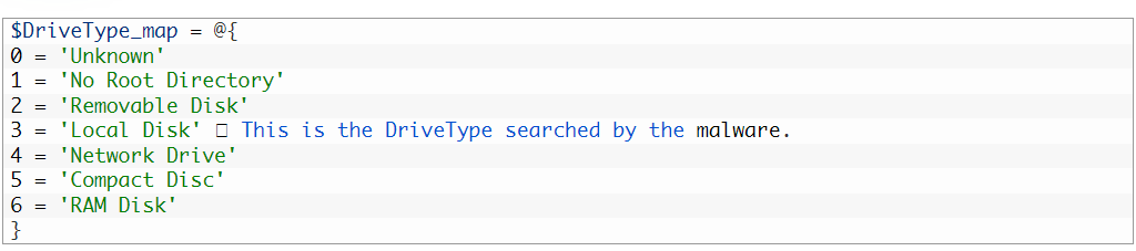 此后,脚本继续依赖 WMI 查询有关操作系统的信息。然后,它会执行磁盘大小调整操作,这些操作可能会因操作系统版本检查的结果而异。这些操作仅在固定驱动器(DriveType = 3)上执行。文件系统中通常存在以下驱动器类型: