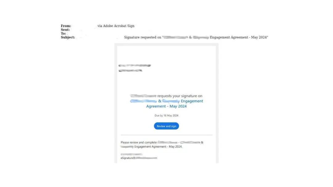 电子邮件仍然是最广泛使用的钓鱼渠道之一。在下面的例子中,攻击者冒充需要与目标组织签署协议的法人实体代表。攻击者通常使用与合法公司非常相似的电子邮件地址。在这里,他们使用了一种模仿常见企业服务模板的网络钓鱼表单。