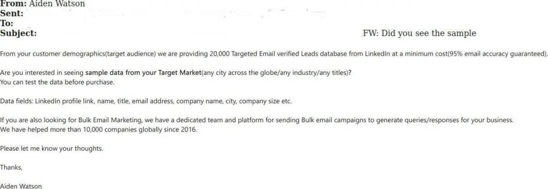我们发现多起针对中小企业的垃圾邮件案例。垃圾邮件发送者以看似诱人的信用交易或一次性大折扣的形式向组织机构发送垃圾邮件。提供的服务范围通常符合中小企业的需求——量身定制的品牌解决方案、广告产品、财务支持等。在下面的例子中,垃圾邮件发送者提供了一个客户数据库,用于研究和营销目的。
