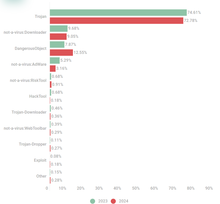 木马攻击尤其危险,因为它们模仿合法软件,这使得它们更难被检测和预防。它们的多功能性和绕过传统安全措施的能力使它们成为网络攻击者普遍使用的有效工具。然而,同比最大的变化源于 DangerousObject 攻击,这是卡巴斯基云技术检测到的恶意软件。DangerousObject 类判定是各种以前未被发现的样本的集合。这一类别的广泛性和不具体性凸显了网络威胁的复杂性和不断发展的性质,使其成为网络安全工作的重大关注点。