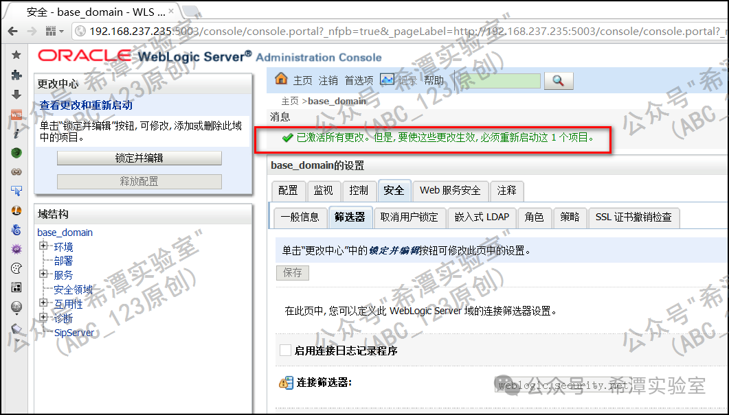经过测试,10.x版本的weblogic禁用T3需要重启,否则不会生效;12.x版本不需要重启,点击“保存”即可立即生效。