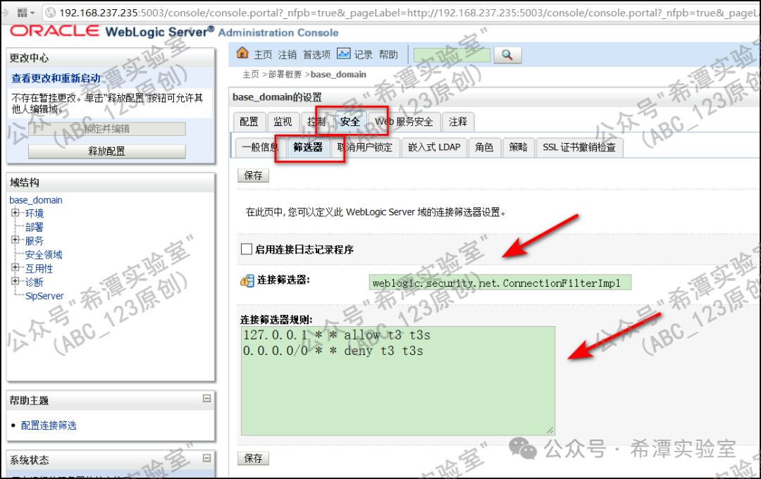 进入weblogic的后台之后,选择“安全”—“筛选器”,在“连接筛选器规则”输入