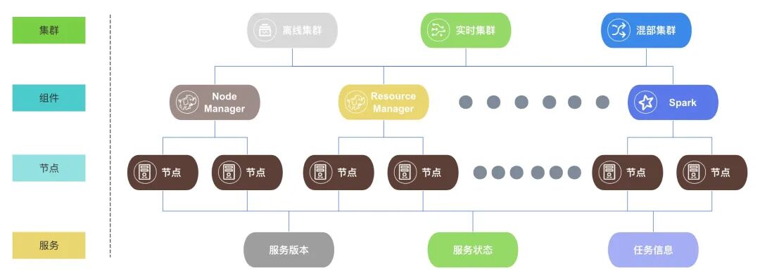通过大数据集群管理平台化的建设,解决我们遇到的迭代效率、稳定性等问题,主要围绕集群管理、节点管理、服务管理、组件管理、节点运行任务等几个维度进行建设,整体逻辑关系如下: