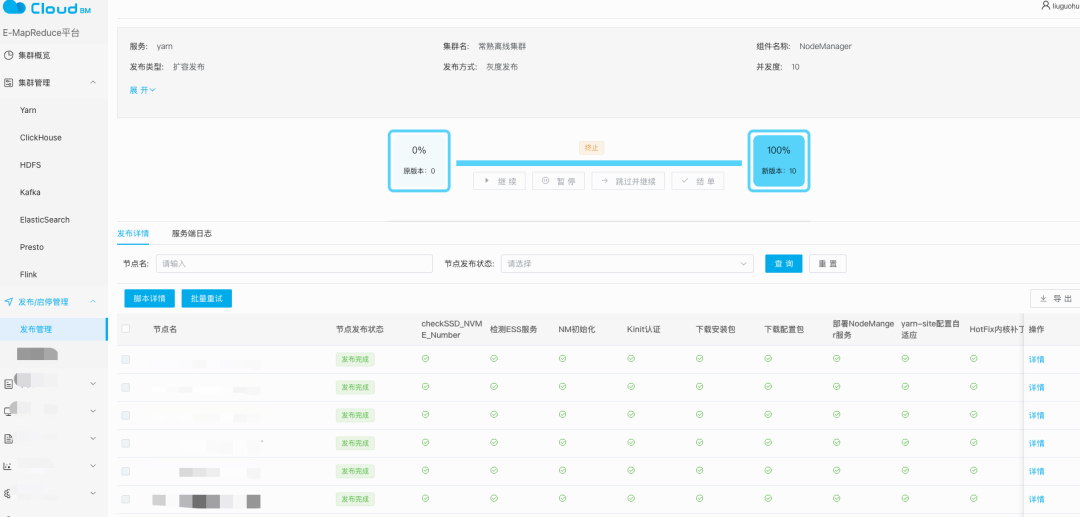 产品层本着‘一站式’的思想, 在操作集群管理时, 用户只需选择发布的组件、对应的主机节点, 及发布策略, 即可快捷完成变更操作。把复杂的逻辑和后端留给BMR,让用户只关心他需要关心的。