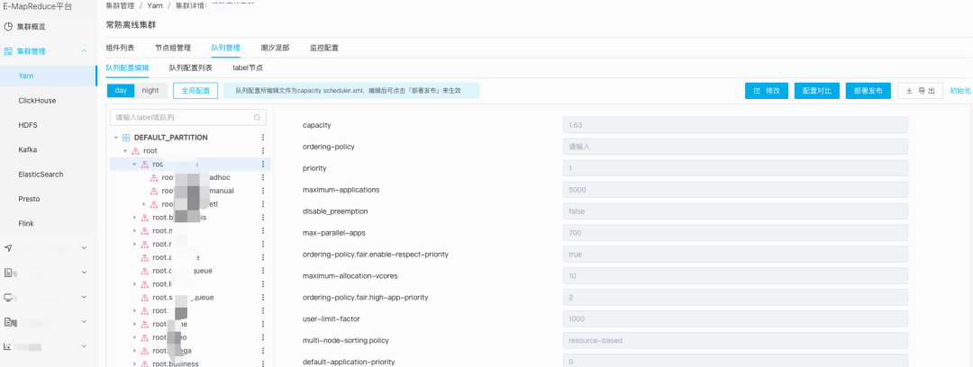 线上Yarn资源调度采用Capacity模式,集群根据不同部门、任务优先级等规则会划分多个队列资源, 前期通过文本编辑的形式对配置进行修改调整,存在编辑繁琐、易出错等问题。BMR为此提供了Yarn队列的在线可视化编辑能力, 支持新增、删减队列、同时会对队列资源的capactiy百分比合法性校验, 也支持队列配置项调整对全局或部分队列生效等快捷操作。如图示意: