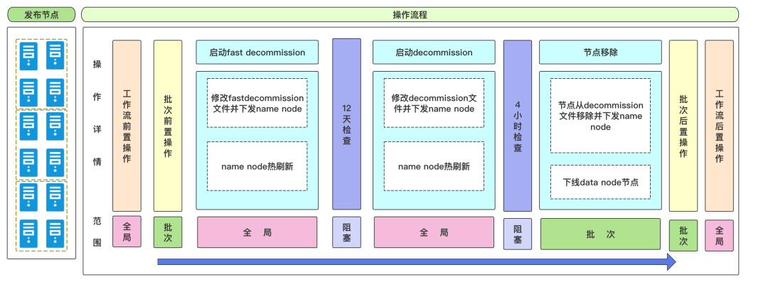在DataNode下线流程中,同时涉及DataNode、NameNode组件的变更。缩容操作步骤中存在全局变更(NameNode节点级别)、部分变更(DN节点即便)、阻塞等待等互斥操作。