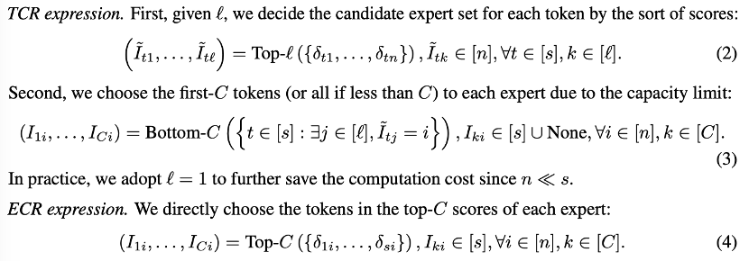 本文延续考虑(1)因其较低的计算代价。而对于 hard router 场景,又可分为 1)Token Choice Router (TCR), 也就是让每个 token 去选 top-k 专家;2)Expert Choice Router (ECR),也就是让每个专家去选择 top-C 合适的 token。由于容量限制,每个专家接收的 token 数有上限 C, 因此在场景 1)中,会对每个专家接收的 token进行截断: