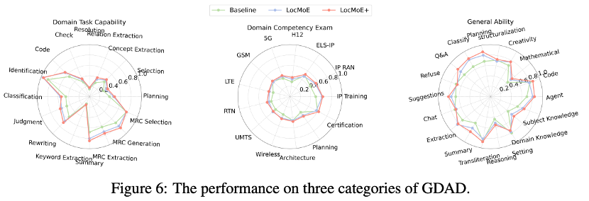 经过充分 SFT 后,LocMoE+ 相比于基线在领域任务能力的 16 个子能力上平均提升了约 20.1%,相比于 LocMoE 则提升了约3.5%。领域能力认证考试则分别提升了 16% 和 4.8%。在通用能力的 18 个子能力中,LocMoE+ 分别提升约 13.9% 和 4.8%。整体而言,LocMoE+ 在 GDAD、C-Eval 和 TeleQnA 上分别表现出 9.7% 到 14.1% 的效果提升。