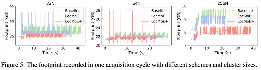 LocMoE+ 对于显存占用也存在一定增益,尤其是集群规模较小计算较密集的场景。使用 Ascend Insight 工具对显存监控样本进行分析,可以看出,LocMoE+ 显存使用相比于基线下降了 4.57% 至 16.27%,相比于 LocMoE 下降了 2.86% 至 10.5%。随着集群规模的增大,显存占用的差距随之缩小。