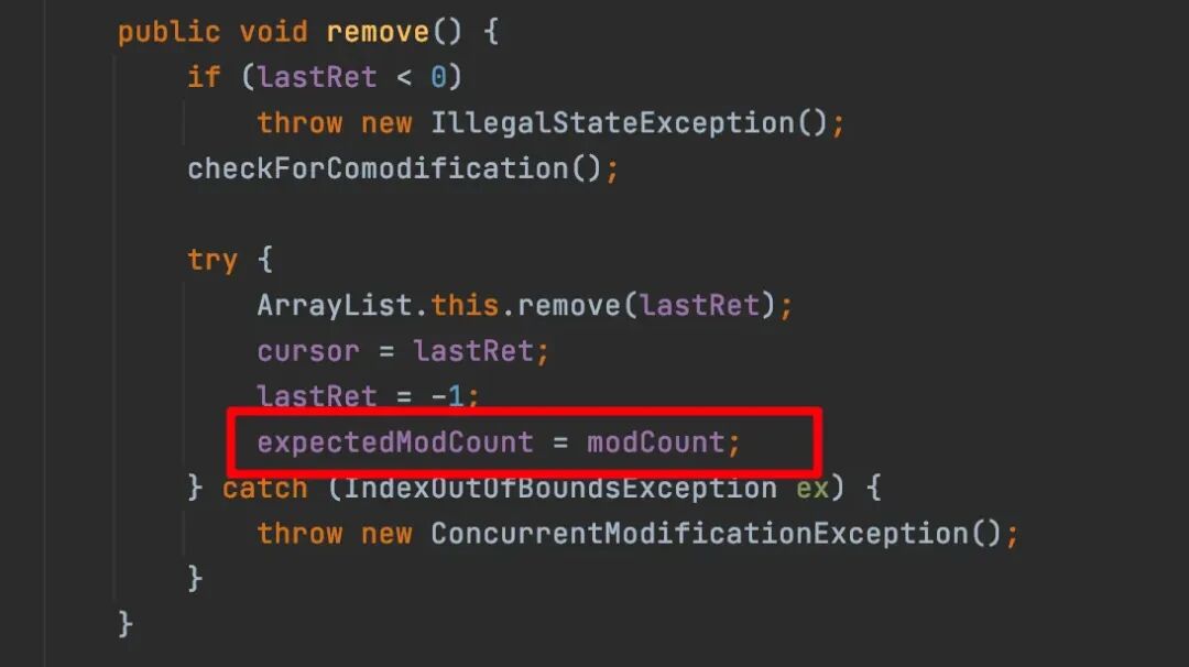 原因是list的迭代器的remove方法,会将exceptedModCount重置: