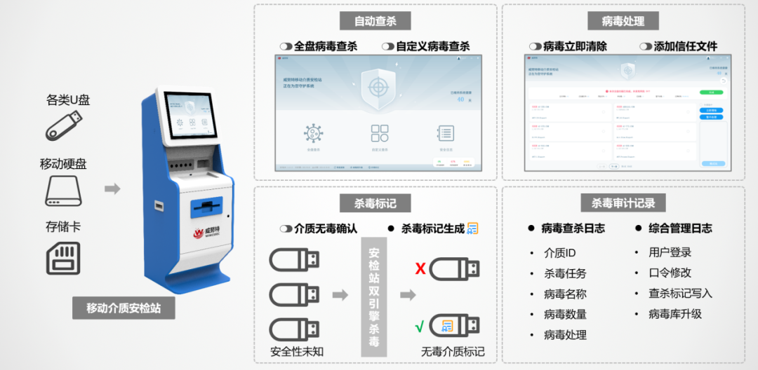 在车间内放置部署移动介质安检站,针对常见数据摆渡手段的移动介质进行管控,存储介质经安检站查杀后自动生成病毒查杀标记,结合工控主机卫士对病毒查杀标记进行验证,无杀毒标记的介质将被阻止读取,实现读写控制、病毒查杀、杀毒校验一体的移动介质综合管控方案,保证车间现场违规使用移动介质导致病毒及恶意代码程序的侵扰,通过技术手段实现企业移动存储介质的闭环管理,降低企业安全管理人员投入,支撑企业安全管理制度的有效落地。