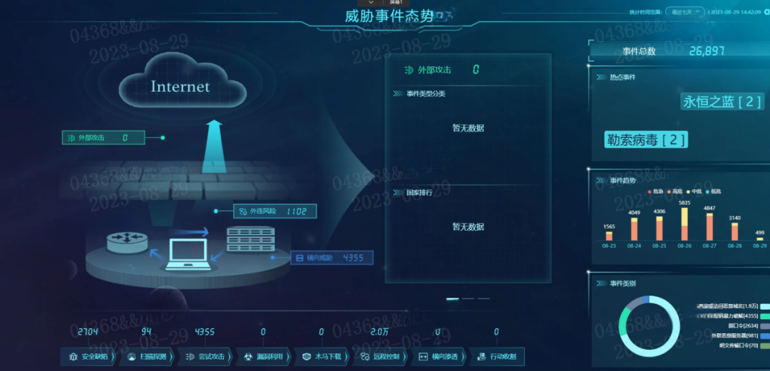经过测试,威努特高级威胁检测系统,准确定位出车间安全问题所在:统计测试时间段内的数据,共检测到总体安全事件26897次,其中主要的热点事件为永恒之蓝和勒索病毒,攻击目的基本可以确认为:“勒索”。