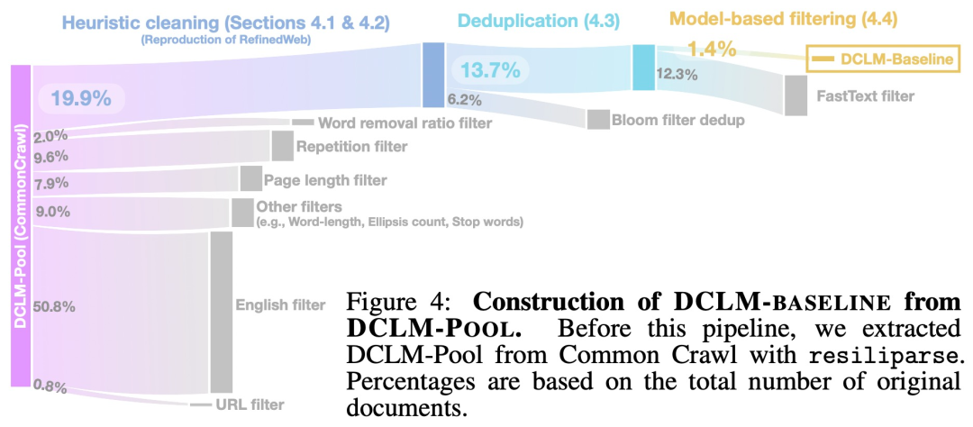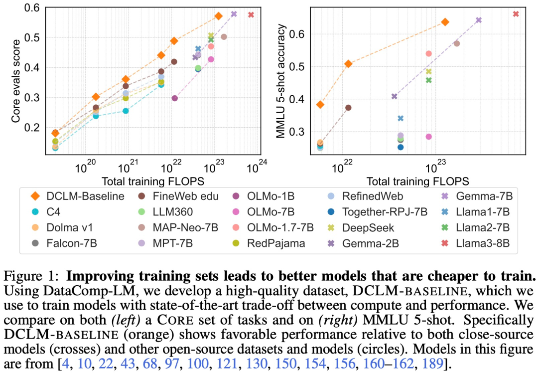 DCLM 整体思路很简单:使用一个标准化的框架来进行实验,包括固定的模型架构、训练代码、超参数和评估,最终找出哪种数据整理策略最适合训练出高性能的模型。