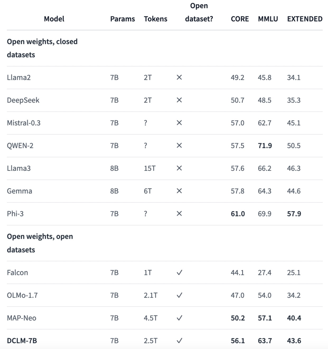 最近,苹果公司作为 DataComp-LM(DCLM)项目的研究机构之一,在 Hugging Face 上发布了 DCLM-7B 开源模型。该模型性能已经超越了 Mistral-7B,并且正在逼近其他领先的开源模型,包括 Llama 3 和 Gemma。