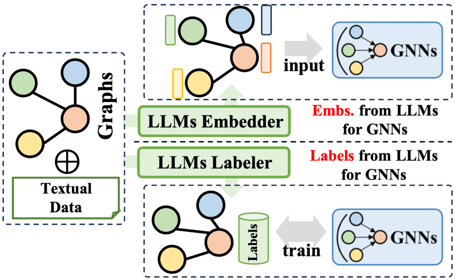 大语言模型(LLMs)前缀法利用大型语言模型生成的丰富信息来优化图神经网络(GNNs)的训练过程。这些信息涵盖了文本内容、LLMs 产生的标签或嵌入等多种数据。根据这些信息的应用方式,相关技术可分为两大类:一是利用 LLMs 生成的嵌入来助力 GNNs 的训练;二是将 LLMs 生成的标签整合到 GNNs 的训练流程中。