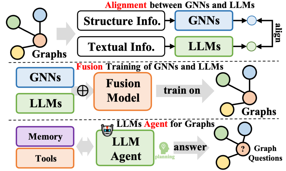 该类方法进一步整合了大型语言模型与图数据,涵盖多样化的方法论,不仅提升了大型语言模型(LLMs)在图处理任务中的能力,同时也优化了图神经网络(GNNs)的参数学习。这些方法可被归纳为三种类型:一是 GNNs 与 LLMs 的融合,旨在实现模型间的深度整合与共同训练;二是 GNNs 与 LLMs 之间的对齐,专注于两种模型在表示或任务层面上的对齐;三是构建基于 LLMs 的自主智能体,以规划和执行图相关任务。