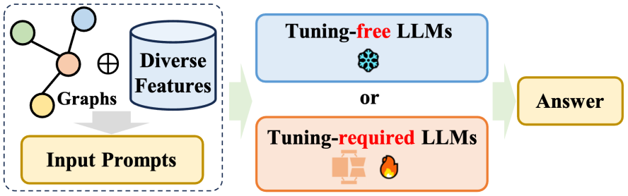 该综述在 LLMs-Only 的章节中详细阐述了直接将大型语言模型(LLMs)应用于各种以图为导向任务的情况,即所谓的 “仅 LLMs” 类别。这些方法的目标是让 LLMs 能够直接接受图结构信息,理解它,并结合这些信息对各种下游任务进行推理。这些方法主要可以分为两大类:i)无需微调的方法,旨在设计 LLMs 能够理解的提示,直接促使预训练的 LLMs 执行以图为导向的任务;ii)需要微调的方法,专注于将图转换为特定方式的序列,并通过微调方法对齐图 token 序列和自然语言 token 序列。