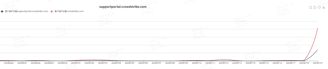 奇安信网络研究院对于CrowdStrike相关网站的访问监测显示,7月19日国内对于CrowdStrike支持网站的访问量出现了上百倍的增长,可见国内对此事件的关注度与处置力度也很高: