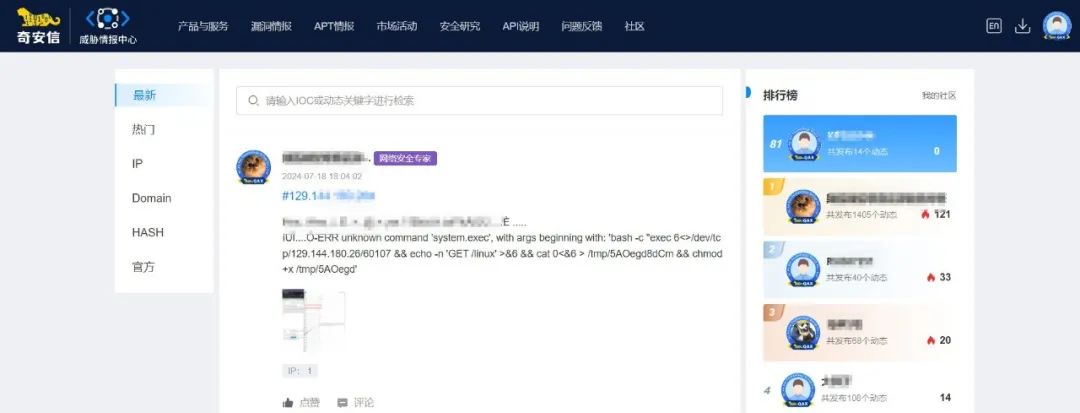 网络安全专家由奇安信威胁分析平台(ALPHA)数据统计平台综合评估选出,包含但不限于使用ALPHA平台【威胁研判、红雨滴云沙箱、分析任务管理、情报专家社区、漏洞查询】等高频次用户;
