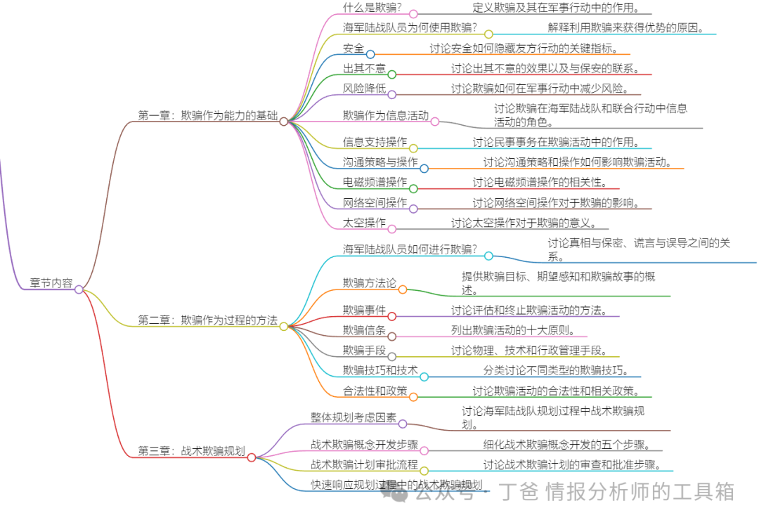 - 军事欺骗的规划过程: 考虑风险和潜在收益,制定欺骗计划,包括使命分析、指导方针、工作人员欺骗评估等步骤。
