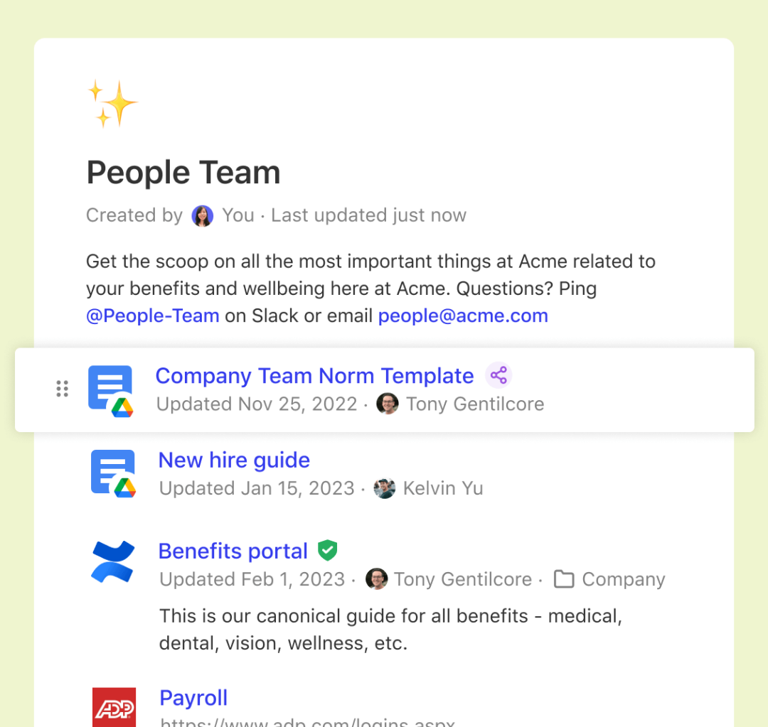 HR 团队可以将入职相关的文档和链接整合到一个专门的集合中|图片来源:Glean 官网