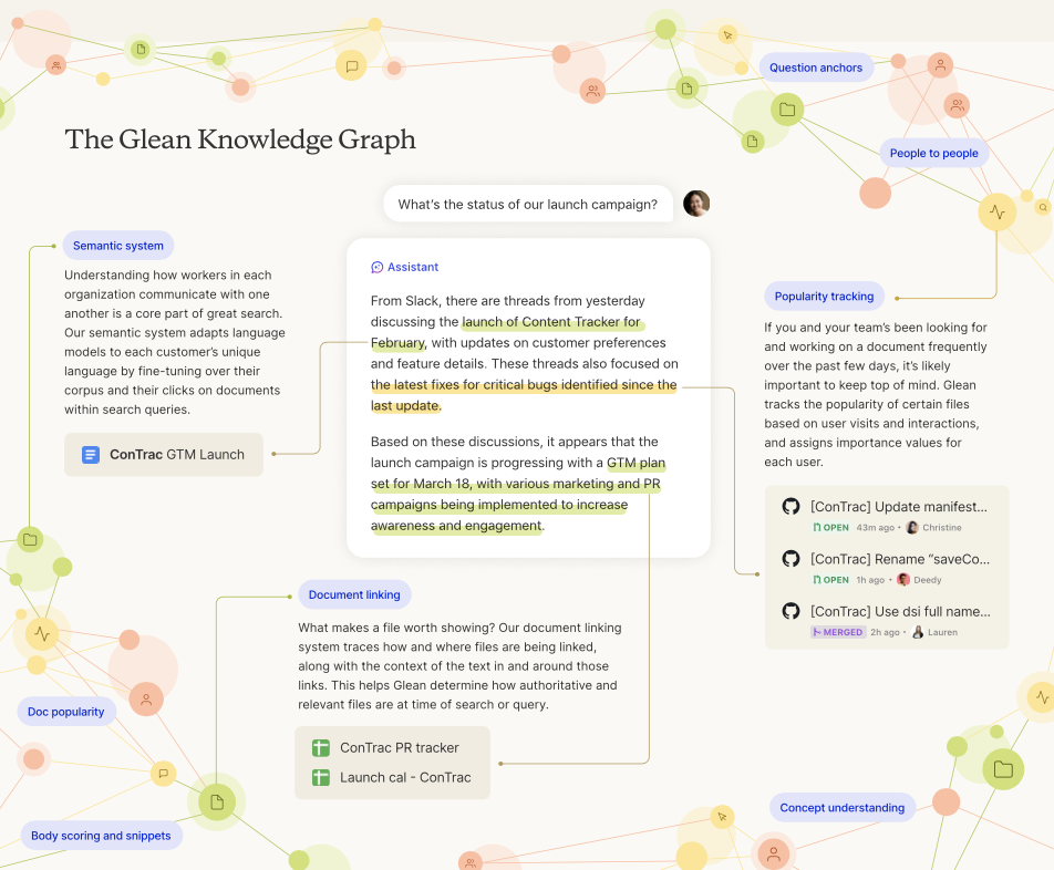 对此,Glean 创始人 Arvind Jain 表示,「通过这些功能强大的更新,Glean 将企业搜索提升到了一个新的高度。我们正在提供一种辅助系统,使企业用户不仅能与公司知识保持联系,还能相互联系,从而在日益复杂的数字工作环境中推动前进。」