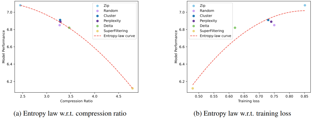 这意味着模型性能与数据压缩率和训练损失相关。我们将这种关系称为 Entropy law。