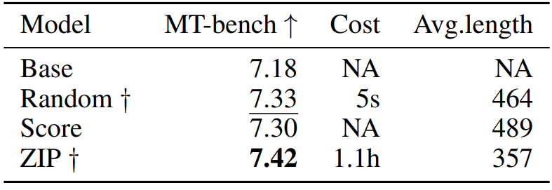 得益于 ZIP 的模型无关、内容无感知的特性,其同样也可应用于偏好对齐阶段的数据选择。而 ZIP 所选择的数据同样展现出了较大的优势。具体结果见下表: