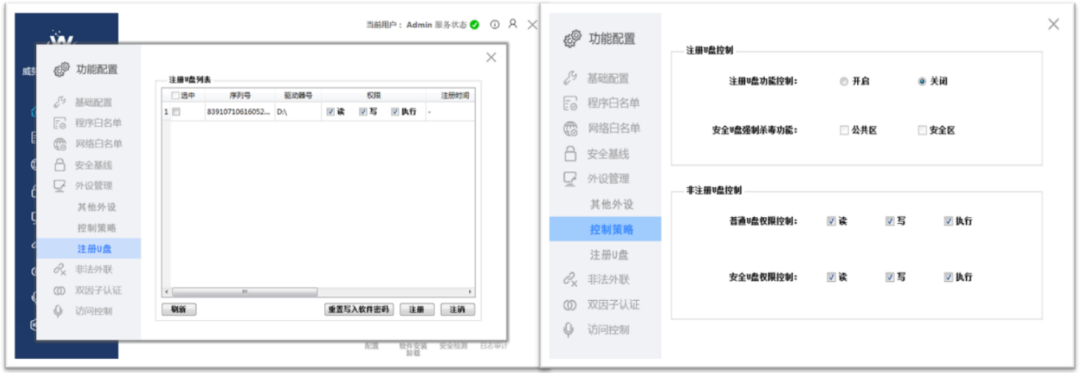 针对外设管控的核心目标是保证数据安全传输的前提下,对移动介质注册、授权、安全写入、病毒查杀、杀毒验证、策略读写等全流程管控。另外主机防护产品针对其他外设应该也具备管控能力,包括不限于:光驱控制、无线网卡控制、蓝牙设备控制、串口设备控制、并口设备控制等。