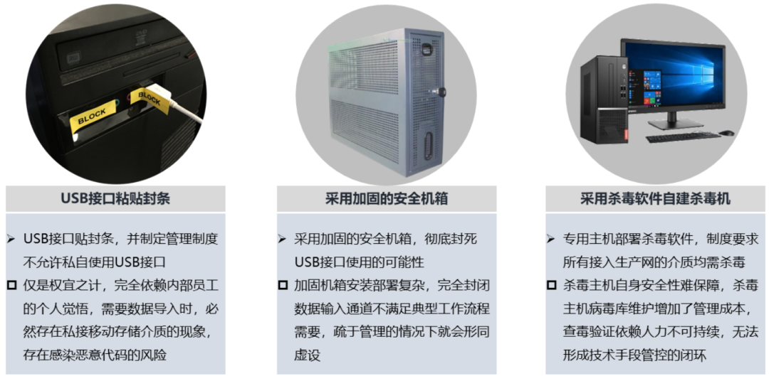 目前移动介质管控的常用的包括:传统物理封堵或自建杀毒主机的方式、介质管控软件;硬件摆渡等方式。