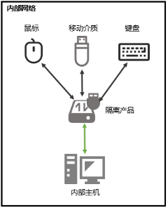 另外在某些无法安装软件的场景中,一般采用硬件隔离的方式对移动介质进行管控,在移动介质与内部主机之间增加隔离产品实现物理隔离,同时通过隔离产品的管理软件,实现不同U盘的访问策略和读写权限。在部署隔离产品时,内部主机上除隔离产品连接使用的USB接口外的其他USB口采用物理隔离方式封闭,鼠标、键盘等其余外设设备皆连接在隔离产品上。通过专有隔离硬件在移动介质与计算机之间形成物理隔离区,实现对移动介质中的数据文件进行预读处理,阻挡恶意文件的拷贝并进行文件过滤,从而保障移动介质的数据的安全可靠的读写。