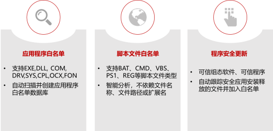 白名单技术在应用过程中需要关注其全面性和可用性。全面性是指能够覆盖操作系统及其承载的业务全覆盖,常见的是应用程序白名单、脚本白名单和进程白名单,各类白名单支持的对象不同,相应控制颗粒度也不同;可用性是指在白名单在建立和更新不同阶段都要保证白名单不被污染,避免恶意程序被加入到白名单库中,可用性层面各厂商在实现上方法不一,如建立前先开展病毒查杀,更新时通过校验hash值等。总而言之,可用性维度的衡量标准是如何建立无污染的白名单库以及在后续白名单库更新过程中的安全。