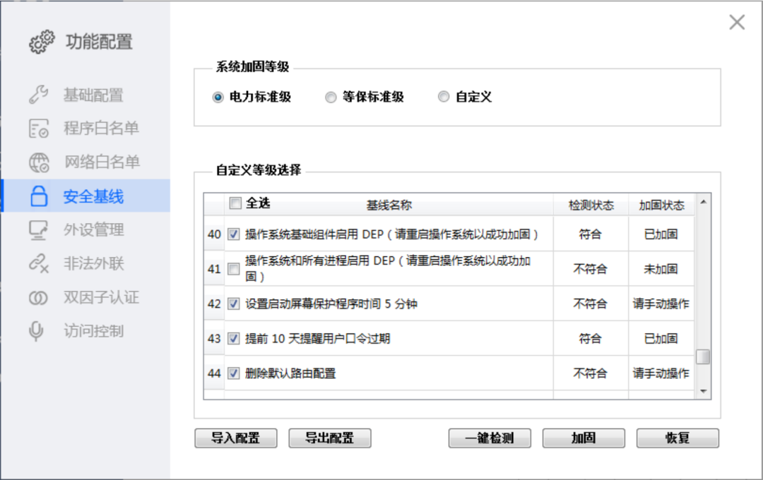 早期现场的工业主机一般在投运前并未对操作系统进行安全加固,为确保系统在安全性方面达到一定的基本要求。制定和实施操作系统安全基线加固是保护系统免受各种安全威胁的重要措施之一。
