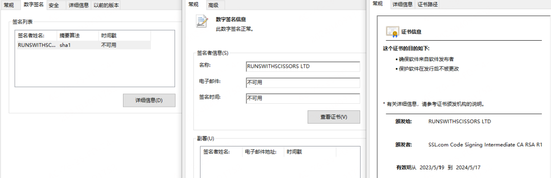Winver.exe是一个由Golang编译的恶意软件,并且带有数字签名“RUNSWITHSCISSORS LTD”,具体如下图所示。