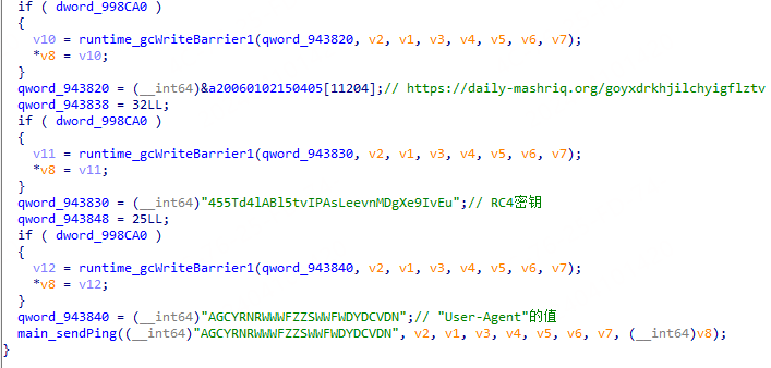 Winver样本执行时先获取C2的硬编码值,接着对RC4的密钥和 User-Agent的值进行初始化。