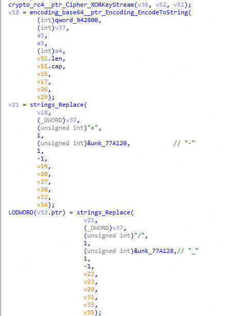 将获取的信息采用RC4+Base64的方式进行加密,并将Base64结果中的“+”替换成“-”和“/”替换成“_”。