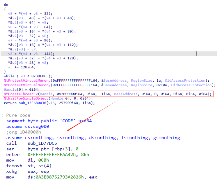 msedge.exe是一个Rust编译的用于内存加载执行最终载荷的加载器,通过使用更加底层的API函数,以创建线程的方式执行ShellCode,然后通过内存加载的方式,最终执行.Net载荷。此外我们也发现了通过NtQueueApcThread执行shellcode的攻击样本,该样本与msedge.exe只是shellcode执行方式不一致,其他均一致。