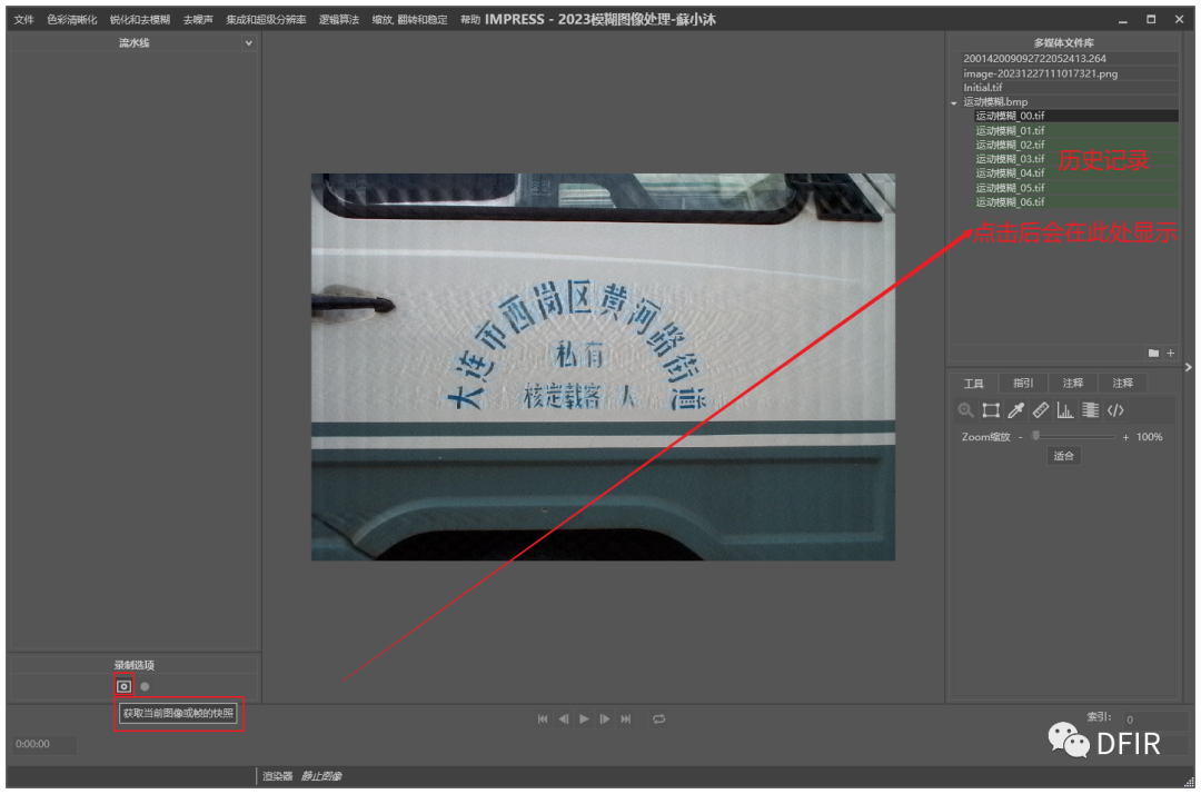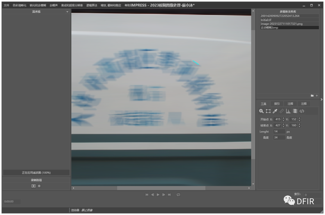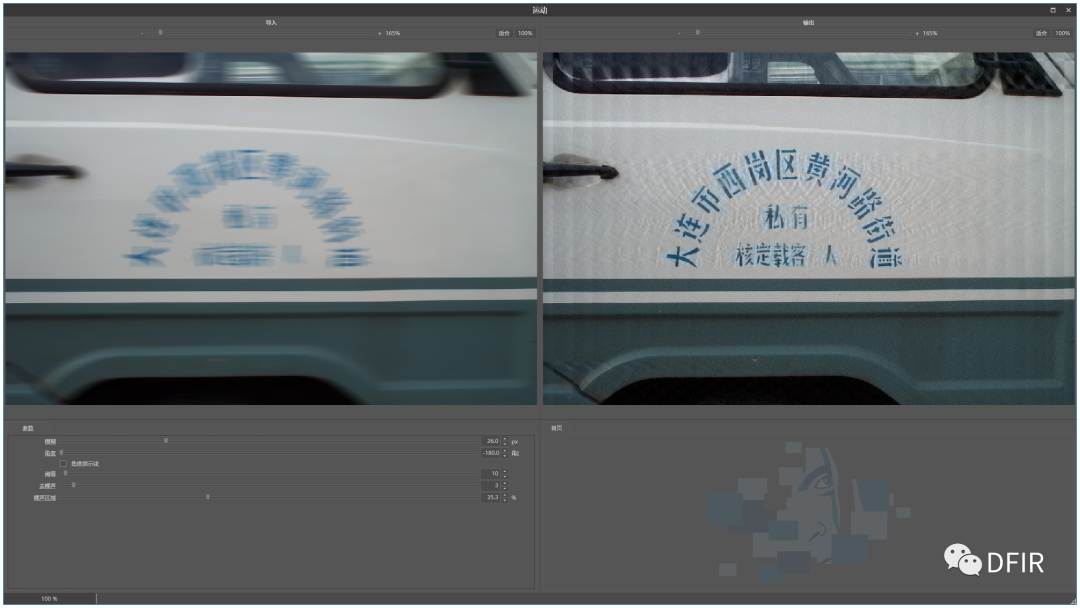 【处理流程:1:右侧工具栏->工具->测量工具(测量模糊角度及距离);2:锐化和去模糊->运动(将"标尺"测的数据填充至滤波器参数栏,微调参数找到质量最佳的图像)->细节(进一步调整参数)】