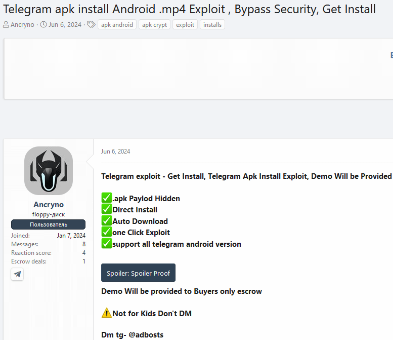 该漏洞最初被发现于2024年6月6日,当时ESET研究人员在一个地下论坛上看到了一则关于该漏洞的广告。化名“Ancryno”的卖家以未公开的价格出售该零日漏洞,声称其适用于Telegram版本10.14.4及更早版本。于是ESET追踪到相关频道,获取恶意负载并进行详细分析。